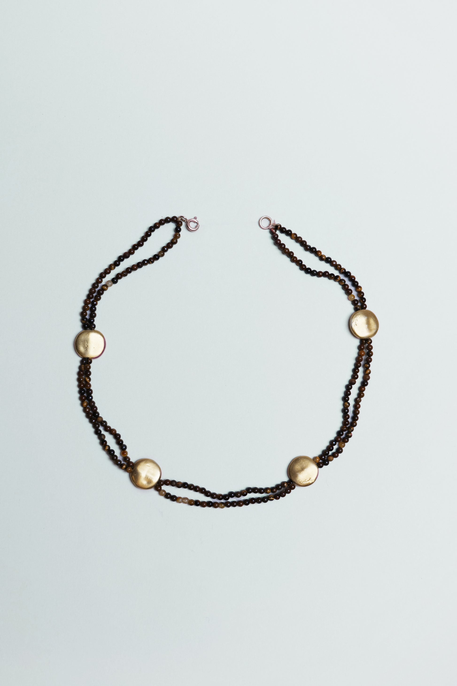 Colgante doble compuesto de piedras hiladas, de color verde en la versión plateada y marrones en la dorada, con piezas redondas y planas distribuidas a lo largo de la pieza, recreando la forma de una piedra de rio.