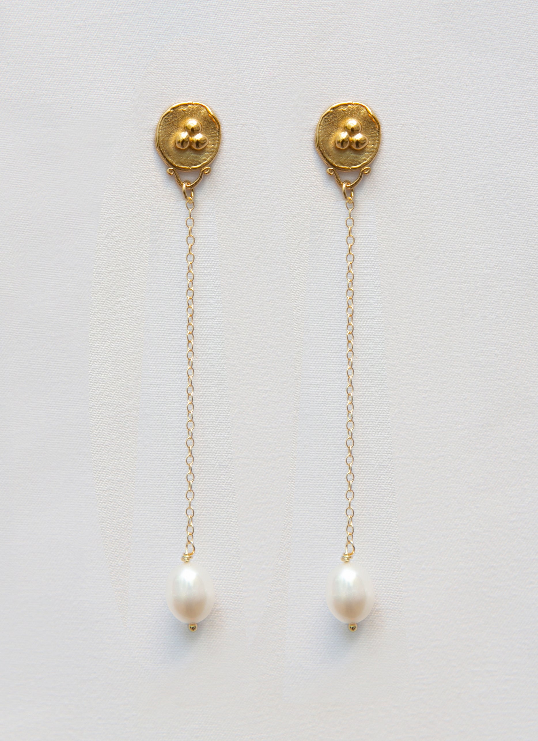 Pendientes articulados con una pieza superior y una perla unidas por una cadena delicada, la cual permite un movimiento suave y elegante.